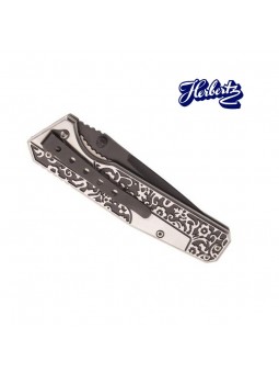 Couteau HERBERTZ, lame acier 420 à cran, manche 11 cm inox motif floral avec inserts décor cerfs. Personnalisez sa lame par Prénom - Nom - Message...