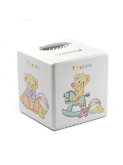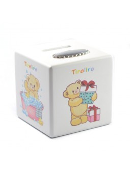 Tirelire en forme de cube avec la représentation d'un ourson. Personnaliser cette tirelire par un prénom gravé.
