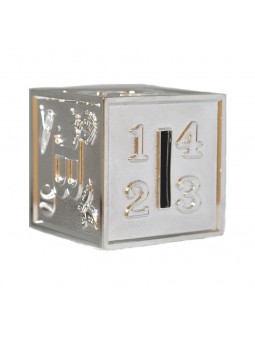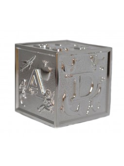 Cette tirelire est de forme cubique avec des motifs enfantins. Nous vous proposons de personnaliser cette tirelire par un texte gravé sur une plaque en métal apposée sur le dessus de la tirelire