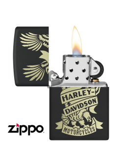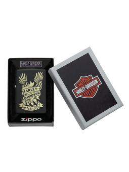 Zippo de couleur noir mat avec Logo doré sur le thème Harley Davidson Personnalisez sur le Verso par un texte - ImageSur la Tranche par Prénom - Nom - Petit messageLivré en coffret Compatible avec les différents inserts: Arc Insert - Butane Single Flame - Butane Double Flame