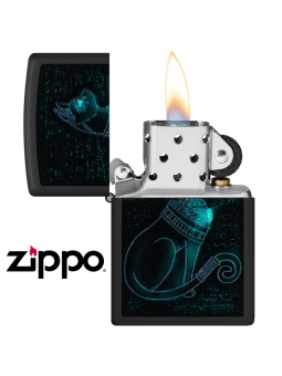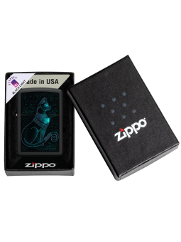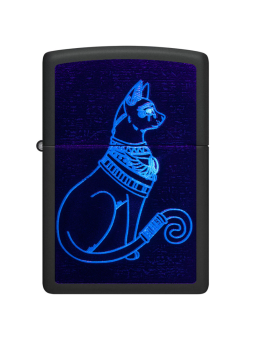 Briquet Zippo Chat spirituel - symbole de chance et de protection dans l'antiquité égyptienne, Sur ce briquet noir mat, un félin majestueux contemple un mur de hiéroglyphes, dans le style de l’art égyptien dynastique. Le motif s’illumine sous la lumière ultraviolette Personnalisez par un Prénom -...