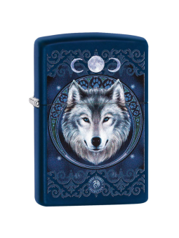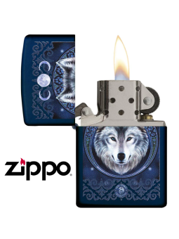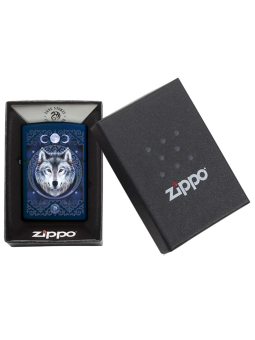 Zippo bleu marine mat sur le thème du Loup et de la pleine lune Collection de l'artiste Anne Stokes Personnalisez sur le Verso par un texte - Image Sur la Tranche par Prénom - Nom - Petit message Livré en coffret Compatible avec les différents inserts: Arc Insert - Butane Single Flame - Butane...