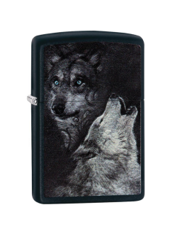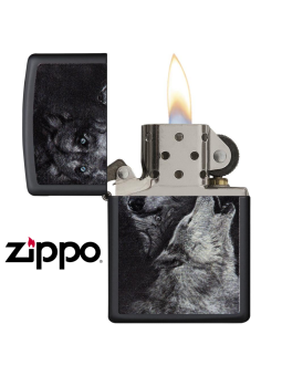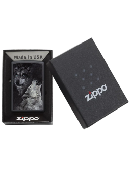 Zippo noir mat sur le thème du Loup Impression couleur de deux loups dont l'un hurle Personnalisez sur le Verso par un texte - Image Sur la Tranche par Prénom - Nom - Petit message Livré en coffret Compatible avec les différents inserts: Arc Insert - Butane Single Flame - Butane Double Flame