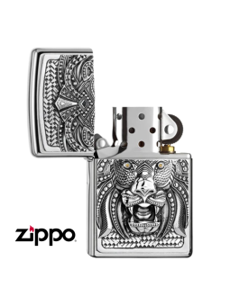 Zippo Chromé brossé sur le thème du Lion Personnalisez sur le Verso par un texte - Image Sur la Tranche par Prénom - Nom - Petit message Livré en coffret Compatible avec les différents inserts: Arc Insert - Butane Single Flame - Butane Double Flame