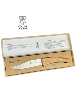 Couteau à fromage Thiers par Claude Dozorme, son manche est en bois d'olivier et sa lame en acier inoxydable. Ce couteau est livré dans un coffret en bois de chêne, vous pouvez le personnaliser par un texte gravé sur le manche.
