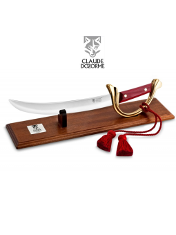 Sabre à champagne Claude Dozorme " Ligne Prestige " Made in France. " Sabre NEY " Son manche est en Lamina rouge, possède une garde doré à l'or fin. Personnalisez ce sabre par un texte gravé. Gravure offerte Ce sabre est livré avec son socle en bois d'Acajou et un livret sur l’art de sabrer le...