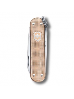 Couteau Classic Alox quadrillé teinte Rose Pêche - VICTORINOX Equipé d'une lame - Une lime à ongles - Ciseaux Personnalisez sa lame Le compagnon de votre quotidien Existe dans d'autres coloris