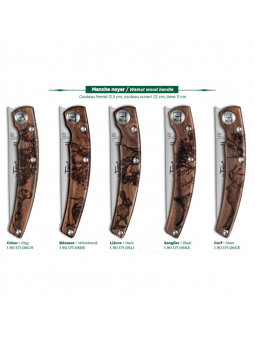 Couteau Le Thiers Animalis - Claude Dozorme Manche en noyer avec un hommage à la faune Thème Sanglier - Manche 12.5 cm Système Liner Lock pour blocage de lame Personnalisez côté verso lame et manche Un cadeau d'exception