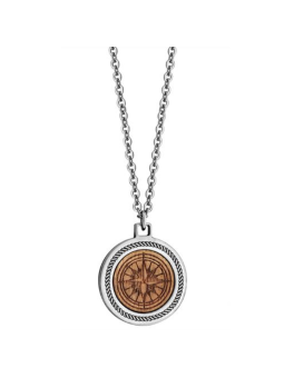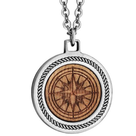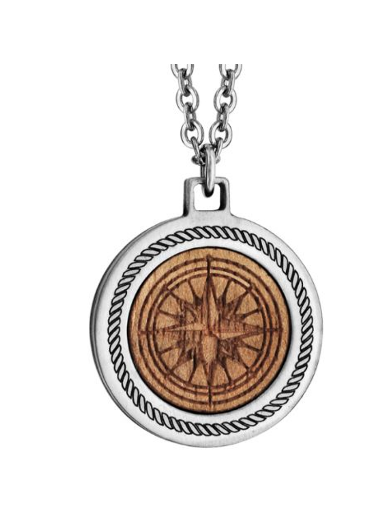 Collier acier et bois avec motif, gravure sur bois représentant une boussole