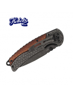 Ce couteau de poche Herbertz à cran dispose d'une lame en acier inoxydable de 8 cm, d'un manche en bois et ses mitres sont gravées d'un motif floral. Nous vous proposons de personnaliser ce couteau herbertz par un texte gravé sur la lame et sur le manche.