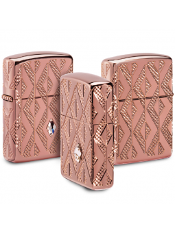 Zippo rose doré sculpté en profondeur avec incrustation de cristal Série numérotée Possibilité de personnaliser le dessus du capot par de belles initiales Livré en coffret en coffret cadeau Compatible avec les différents inserts:Arc Insert - Butane Single Flame - Butane Double Flame