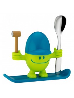 Ce coquetier représente un petit bonhomme bleu sur un surf, il possède une petite cuillère et un marteau pour casser la coquille de l'oeuf.