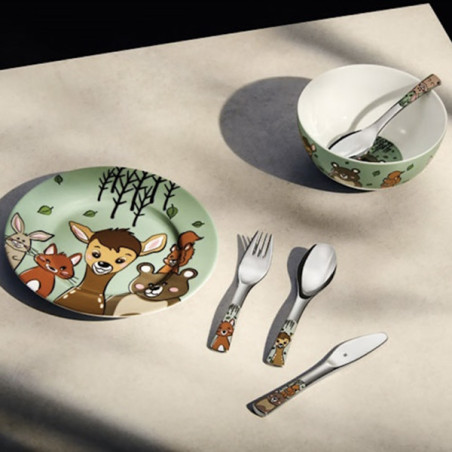 Ce set comprend 1 bol de 13,5 cm et 1 assiette de 18,5 cm en porcelaine décorée ainsi que 4 couverts (fourchette, couteau, grosse cuillère et petite cuillère) avec motifs sur le manche