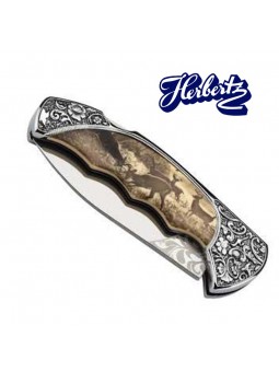 Couteau HERBERTZ, lame acier 420 à cran, manche 11 cm inox motif floral avec inserts décor cerfs. Personnalisez sa lame par Prénom - Nom - Message...