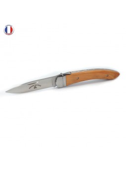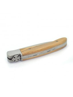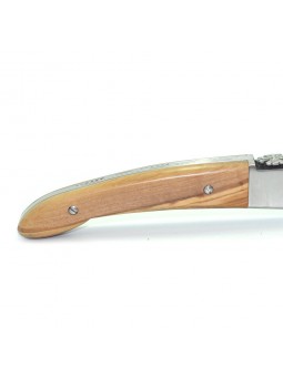 Couteau de poche "L'Occitan", son ressort guilloché est orné de la croix occitane. Manche en bois d'olivier - Lame inox Personnalisez votre couteau par la gravure de lame et de son manche.
