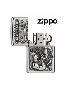 Zippo avec l'emblème du signe zodiaque Sagittaire en relief. Briquet Zodiac Emblem Sagittaire étoilé Le verso du zippo Chromé Brossé / Brillant Personnalisez ce zippo par un texte, logo ou une image gravée. Livré en coffret Compatible avec les différents inserts: Arc Insert - Butane Single...