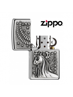 Zippo avec l'emblème du signe zodiaque Capricorne en relief. Briquet Zodiac Emblem Capricorne étoilé Le verso du zippo Chromé Brossé / Brillant Personnalisez ce zippo par un texte, logo ou une image gravée. Livré en coffret Compatible avec les différents inserts: Arc Insert - Butane Single...