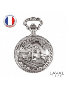 Montre de poche avec couvercle ornementée par un Train en relief Marque française LAVAL Paris Cette montre de poche possède un mouvement quartz ISA 1198 de haute qualité Garantie 2 ans Livré avec sa chaîne en coffret Personnalisez un texte gravé à l'intérieur ou une photo couleur.