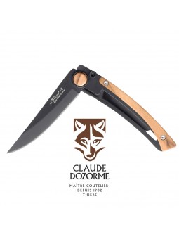 Couteau Liner Lock LE THIERS en acier inox Revêtement noir type Teflon de la lame et du corps du couteau Fabrication française " Claude DOZORME " Manche habillé de bois d'Olivier Ce couteau extra plat se glissera facilement dans votre poche. Personnalisez son manche et sa lame pour un cadeau...