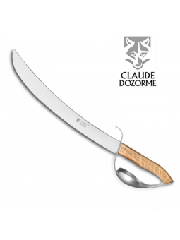 Sabre à champagne " Claude Dozorme " entièrement fabriqué en France. Son manche est en chêne, possède une garde en Aluminium. Sa lame est polie miroir Personnalisez ce sabre par un texte gravé. Gravure offerte Ce sabre est livré avec son socle en bois en Chêne.