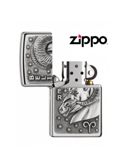 Zippo avec l'emblème du signe zodiaque Bélier en relief. Briquet Zodiac Emblem Bélier étoilé Le verso du zippo Chromé Brossé / Brillant Personnalisez ce zippo par un texte, logo ou une image gravée. Livré en coffret Compatible avec les différents inserts: Arc Insert - Butane Single Flame -...