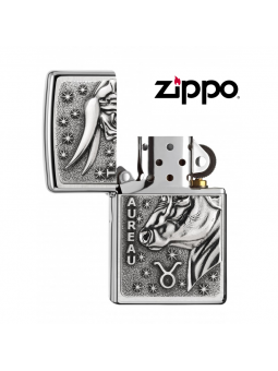 Zippo avec l'emblème du signe zodiaque Taureau en relief. Briquet Zodiac Emblem Taureau étoilé Le verso du zippo Chromé Brossé / Brillant Personnalisez ce zippo par un texte, logo ou une image gravée. Livré en coffret Compatible avec les différents inserts: Arc Insert - Butane Single Flame -...