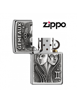 Zippo avec l'emblème du signe zodiaque Gémeaux en relief. Briquet Zodiac Emblem Gémeaux étoilé Le verso du zippo Chromé Brossé / Brillant Personnalisez ce zippo par un texte, logo ou une image gravée. Livré en coffret Compatible avec les différents inserts: Arc Insert - Butane Single Flame -...