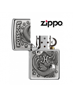 Zippo avec l'emblème du signe zodiaque Poisson en relief. Briquet Zodiac Emblem Poisson étoilé Le verso du zippo Chromé Brossé / Brillant Personnalisez ce zippo par un texte, logo ou une image gravée. Livré en coffret Compatible avec les différents inserts: Arc Insert - Butane Single Flame -...